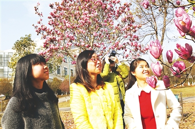 13日,武夷学院生态公园,游人在拍摄观赏玉兰花。近年来,这所学院加大绿化美化生态环境建设,把校园建成公园。近期,武夷学院生态公园玉兰花、桃花纷纷绽放,吸引游人前来观赏。 (邱汝泉 摄)