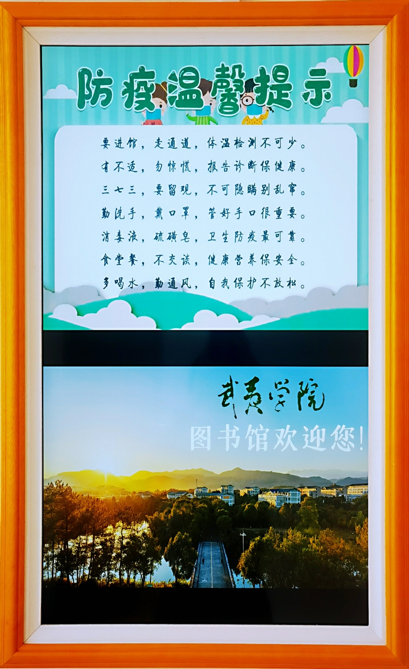 在疫情防控方面,严把入口、开放限流,严格门禁与动态管控相结合,对进馆人数实行控制,经过体温、口罩佩戴等检测,凭人脸识别或一卡通进馆。由图书馆馆员、学管会学生以及校团委志愿者服务队所组成的队伍,在阅览室、书库、自习室等公共区域巡查劝导,确保一米安全距离。通过电子屏和广播系统定时播放温馨提示语,通过QQ、微信群、微信公众号等平台传达学校和图书馆的防控要求。同时,撤销综合阅览室一半的座位,实行严格的预约管理,为确保座位满足需求,采取对书库二延长开放7小时的措施。