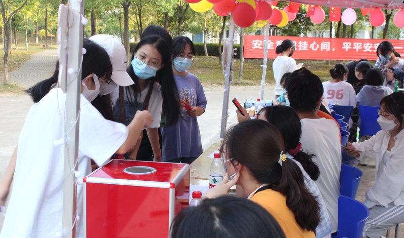 线下活动现场,竖立一面红色祝福墙,师生们饱含深情地写下对祖国母亲的美好祝福,粘贴到祝福墙上。“学党史忆征程”活动,师生通过参与“投飞镖扎气球”“保龄球”“党史答题”“成语接龙”“你扔我接”等五个游戏闯关活动获得一个“党史事件”标签,按照党史事件发生的时间排序,兑换精美礼品,以师生喜闻乐见的形式学习党史,热闹非凡。