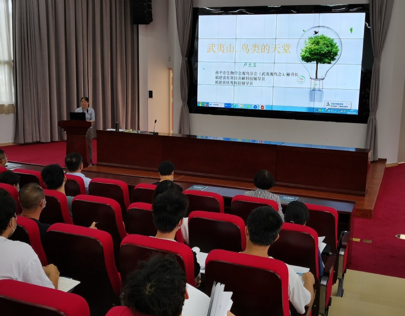 本次党建共建活动,还邀请了南平市生物学会观鸟分会(武夷观鸟会)秘书长、南平一中高级生物教师卢文玉主讲本学期开设的《走进武夷山国家公园》系列选修课“武夷山国家公园——鸟的天堂”。武夷山素有“鸟的天堂”的美誉,精彩的“鸟课”不仅吸引了我校100多位师生聆听,附近众多武夷观鸟爱好者闻讯也慕名前来听课。卢文玉图文并茂地介绍武夷山国家公园鸟类的情况,结合展播鸟类的视频和照片,解读传达了习近平总书记调研武夷山国家公园的讲话精神,引导师生保护好“武夷山无与伦比的生态人文资源”,牢固树立“两山”理念,进一步增强保护生态环境、守护国家公园的意识。