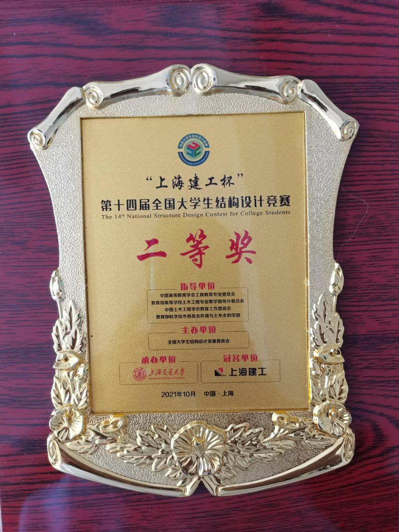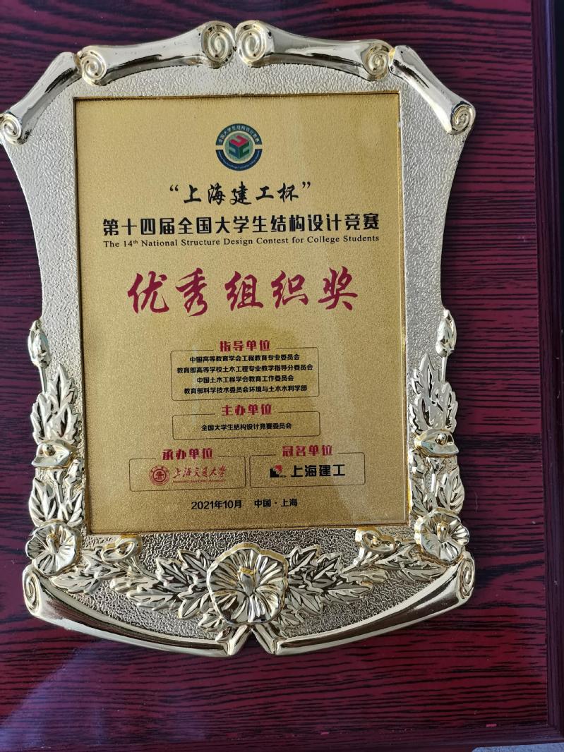 10月14日至17日,第十四届“上海建工杯”全国大学生结构设计竞赛在上海交通大学霍英东体育馆举行。经过31个省分区赛遴选出的全国111所高校共112支队伍参加了现场模型制作与加载比赛,我校代表队“恰好少年”取得了第22名的优异成绩,并获得二等奖,我校被大赛组委会授予“优秀组织奖”荣誉这是我校在全国大学生结构设计竞赛上取得的第二个重要奖项。
