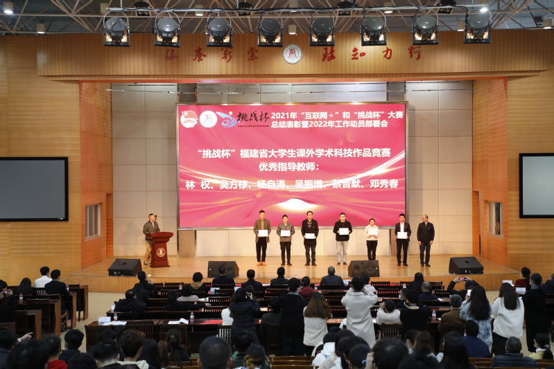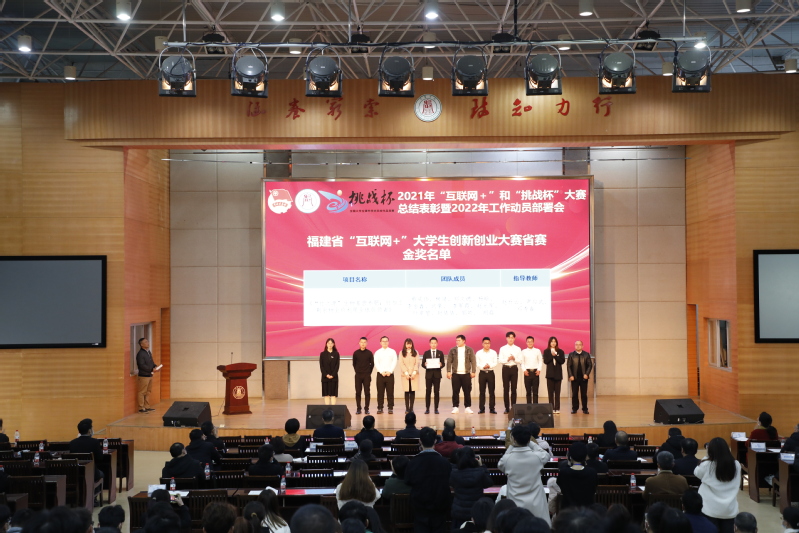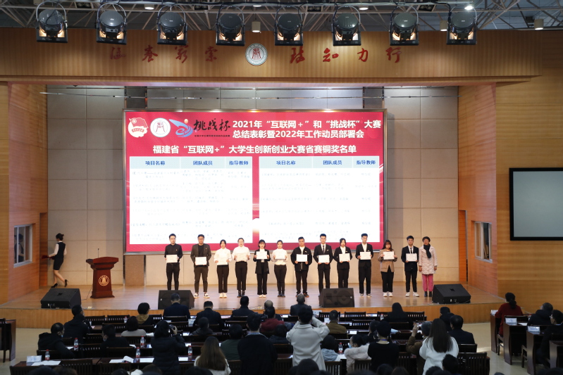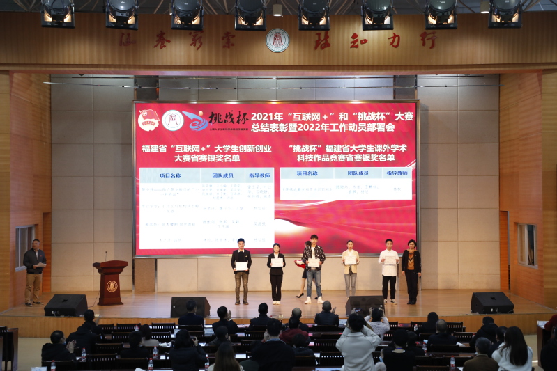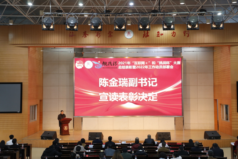 表彰会上,校团委负责同志作大赛总结报告,优秀获奖项目获得者进行项目路演。校党委副书记陈金瑞宣读表彰决定。对2021年“互联网+”和“挑战杯”两项大赛省赛获奖师生进行了表彰。