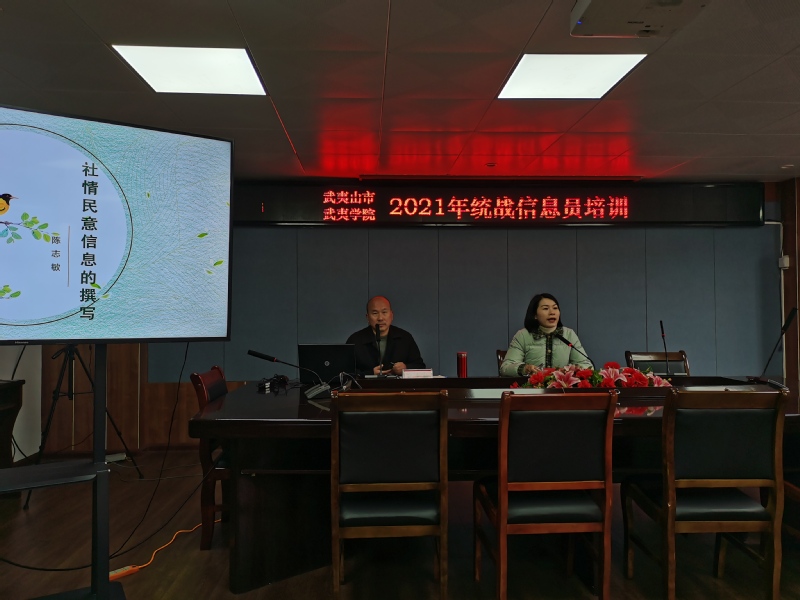 为贯彻落实省委统战部和南平市委统战部有关统战信息工作的部署要求,提高统战信息员信息撰写水平,12月17日,我校与武夷山市委统战部联合举办2021年统战信息员培训班,邀请建瓯市政协委员、建瓯职业中专学校高级讲师、民盟盟员陈志敏作信息培训。武夷山市委统战部副部长、工商联党组书记朱雯娟主持并讲话,我校以及武夷山市各民主党派、统战系统各单位信息骨干约40人参加培训。