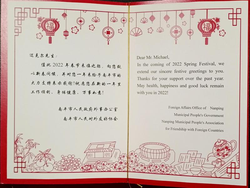 吴建华代表南平市政府表达了对外籍教师和留学生的新年祝福和诚挚问候,并为每一位在校外籍教师和留学生送上精心制作的贺年卡,感谢外籍教师在过去一年中为武夷学院和闽北教育的辛勤付出。同时,他表示在新的一年中,将组织闽北外籍教师与英语教师、英语爱好者开展交流活动,带动大家了解朱子文化、茶文化等中国优秀传统文化,以增进友谊、做世界和平的使者。吴建华还感谢外籍教师及留学生们在工作、学习、生活中的努力以及对我国防疫工作的高度配合。