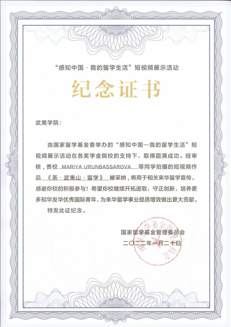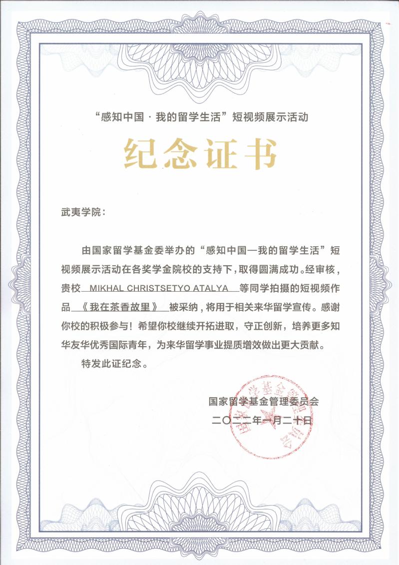 本次活动中,我校海外教育学院拍摄的短视频作品《茶·武夷山·留学》(MARIYA URUNBASSAROVA等同学)、《我在茶香故里》(MIKHAL CHRISTSETYO ATALYA等同学)被国家留学基金管理委员会采纳,将用于来华留学宣传。