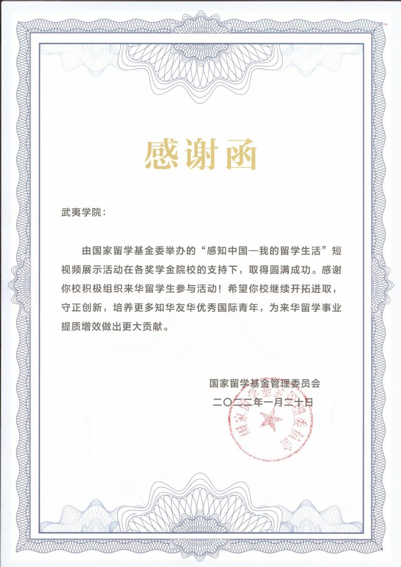 近日,我校收到国家留学基金管理委员会(China Scholarship Council)感谢函,感谢我校积极组织来华留学生参加由国家留学基金委员会举办的“感知中国·我的留学生活”短视频活动,希望我校继续开拓进取,守正创新,培养更多知华友华的优秀国际青年,为来华留学事业提质增效做出更大贡献。
