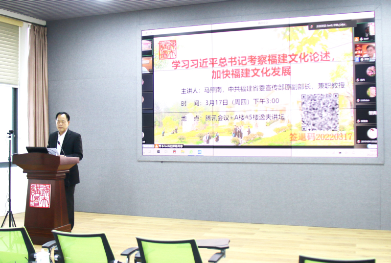 3月17日下午,“逸夫讲坛”举办《学习习近平总书记考察福建文化论述,加快福建文化发展》线上讲座,本期主讲嘉宾邀请了中共福建省委宣传部原副部长兼省委文明办主任,福建省社科联副主席、省政协提案委副主任,现任福建省炎黄文化研究会常务副会长,省教育工委高校思想政治理论课特聘教授马照南。校党委副书记陈金瑞主持。近200名听众线上听取讲座。