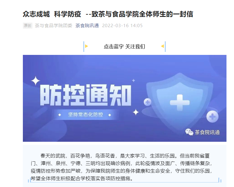 抓牢疫情防控主动权。他带领全体辅导员迅速凝聚起强大的战疫力量,用心筑牢校园疫情防控的坚固防线。从参与拟定发放《致茶与食品学院全体师生的一封信》,到引导学生做科学防控的示范者、群防群控的践行者、理性防控的引导者,彰显学院学工系统的战疫决心。他迅速筹备组织召开疫情防控知识教育宣讲视频会,关切学生疫情期的需求,在切实提升疫情防控应急处置能力和水平上下功夫,饱含茶食学工人的柔情。同时,他将关切延伸到校外实习生,牵头召开在圣农集团实习学生的班会,落实落细学校疫情防控相关要求,做好校外实习毕业生的精细化动态管理。
