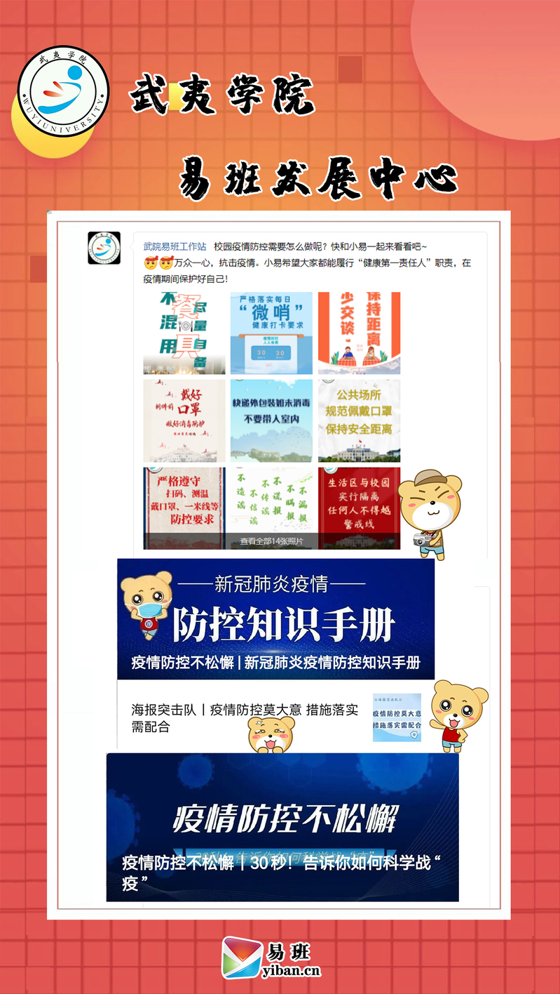 利用易班网、“武夷学院易班工作站”微信公众号、“武院易班工作站”QQ空间公众号三大主要平台,第一时间开展宣传引导,结合学校实际情况及疫情防控政策,撰写《疫情防控莫松懈,同学们都注意啦》、《心怀梦想 踔力奋进——致毕业生的一封信》,绘制包含武夷学院元素的疫情防控政策宣传系列海报,开设《疫情防控不松懈》专栏转发系列科普推文,着重介绍学校最新防疫政策及应急处置预案,同时加强防控法律法规及违法案例宣传警示。