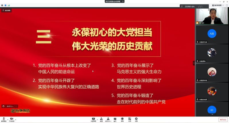 3月31日晚,校党委副书记陈金瑞以“百年奋斗谋复兴 勇毅前行兴伟业”为题,为海峡成功学院21级土木工程和通信工程专业百余名学生通过线上平台讲授了一堂深刻而生动的形势与政策课。
