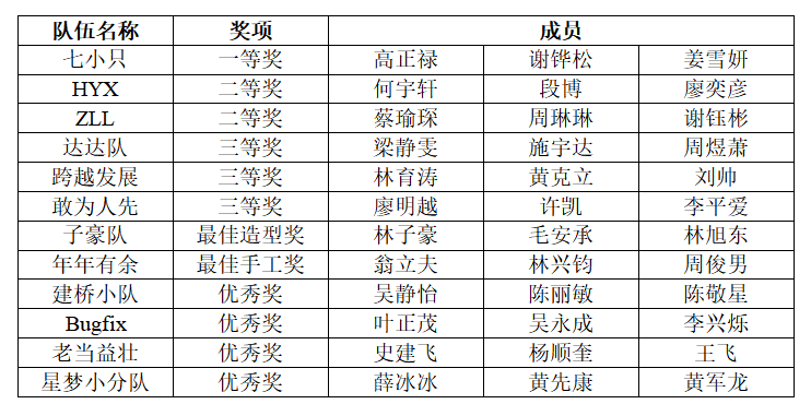 武夷学院第十三届大学生科技节结构模型设计大赛获奖队伍名单