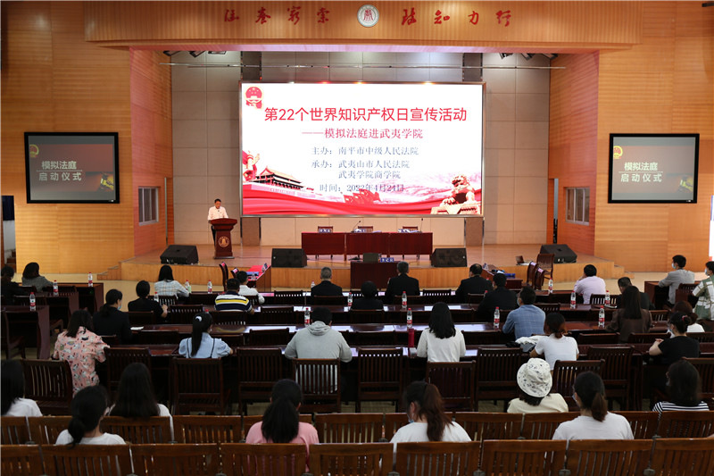 近日,由南平市中级人民法院主办,武夷山市人民法院和武夷学院商学院承办的“模拟法庭进校园”世界知识产权日宣传活动在武夷学院开展。共青团武夷山市团委书记叶维沁,茶叶同业公会会长刘国英,南平市中级人民法院、武夷山市人民法院与武夷学院商学院、武夷山茶产业发展中心、市场监督管理局和茶企代表出席活动,武夷学院商学院2020级保险学专业、国际经济与贸易专业的同学代表参加活动。