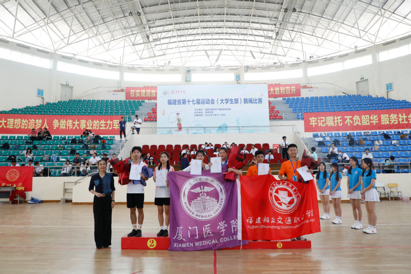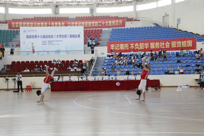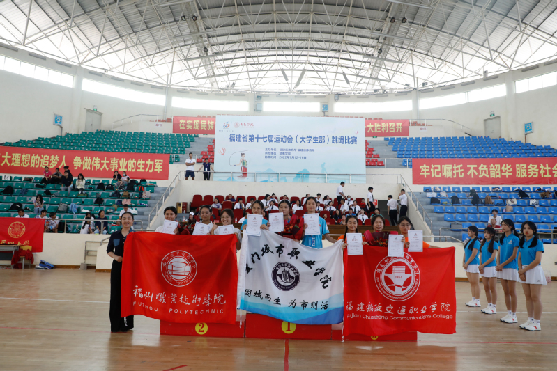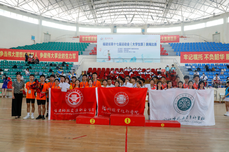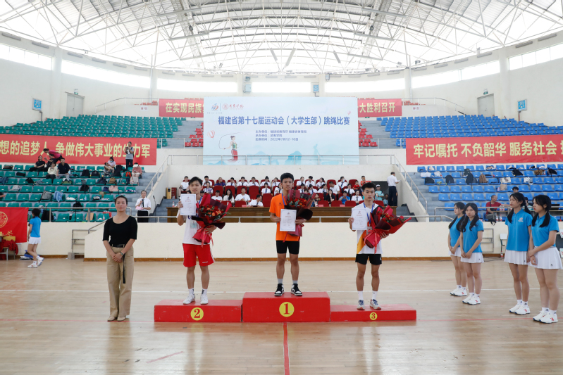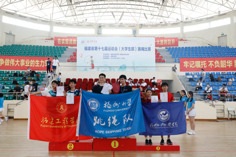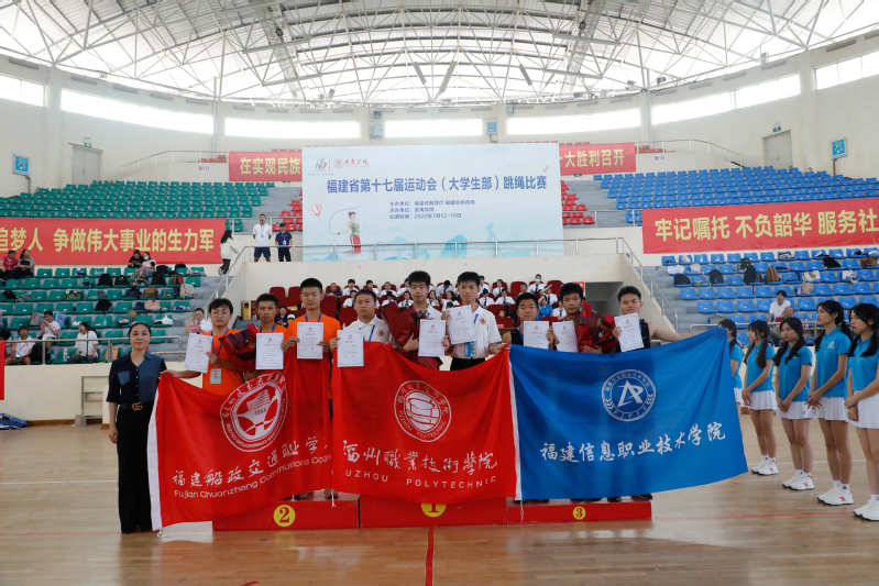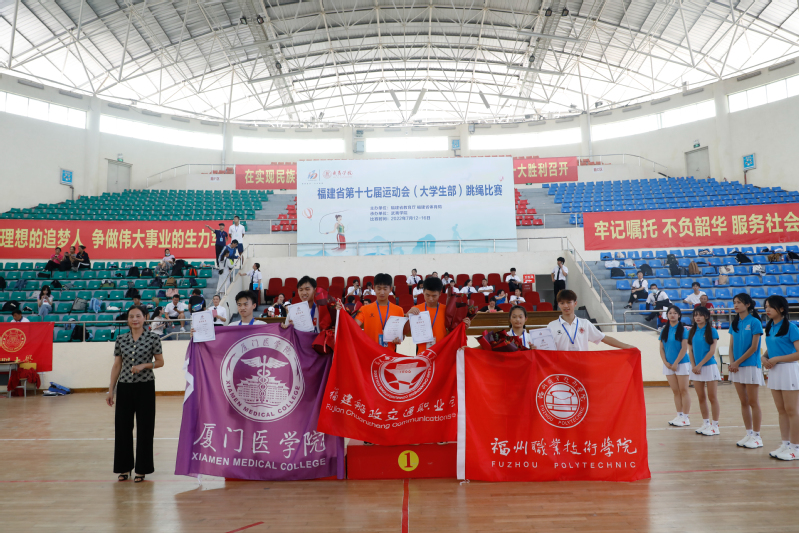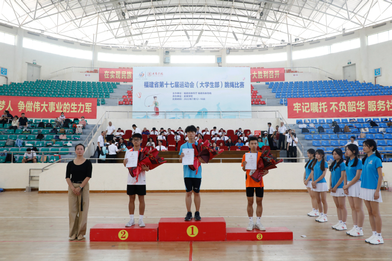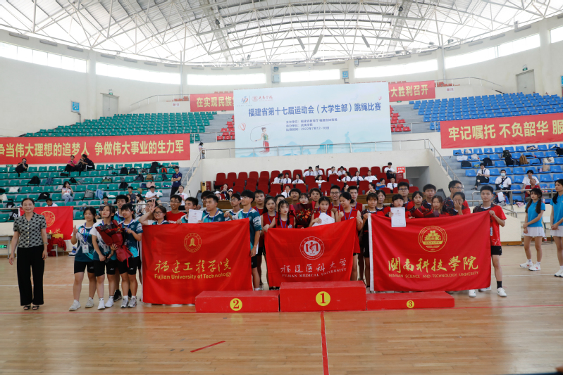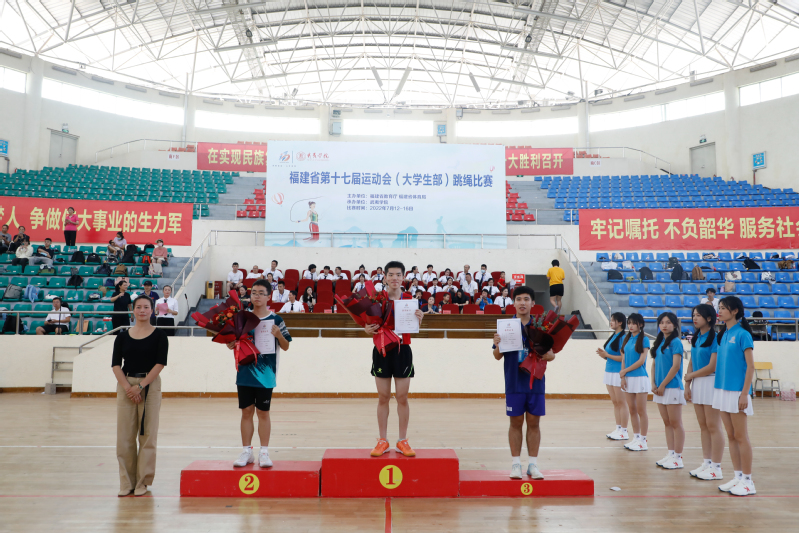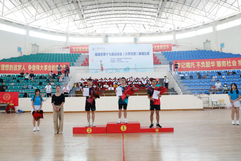 速度赛中,运动员手摇跳绳,跳出了“加速度”;花样赛中,运动员们伴着律动音乐,舞动跳绳,身姿灵巧;团体赛中,队员之间配合默契,随着绳起绳落,鱼贯而入,一气呵成。经过激烈角逐,决出各个项目冠军。30秒双摇跳项目,福建工程学院陈开榜获本科组男子冠军,闽江学院肖燕红、福州大学罗青、福建医科大学郑菲菲并列本科组女子冠军,福建船政交通职业学院马清华、闽江师范高等专科学校蔡佳珍分别获得高职高专组男子、高职高专组女子冠军;2分钟单摇跳项目,福建医科大学何武聪、厦门医学院段丁媛分别获得本科组男子、本科组女子冠军;厦门城市职业学院吴晨晖、闽江师范高等专科学校蔡佳珍分别获得高职高专组男子、高职高专组女子冠军;3x40秒交互绳单摇接力,闽江学院、福建医科大学分别获本科男子组、本科女子组冠军,福州职业技术学院、厦门城市职业学院分别获得高职高专男子组、女子组冠军;两人车轮花样项目,福建工程学院、厦门医学院分别获得本科组、高职高专组冠军;双人同步花样,福州大学、福建船政交通职业学院分别获得本科组、高职高专组冠军;3分钟长绳8字跳项目,福建医科大学、福州职业技术学院分别获得本科组、高职高专组冠军。