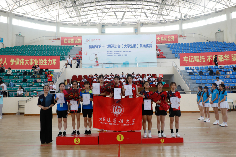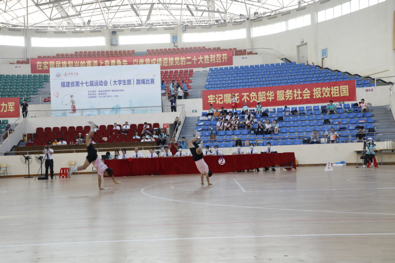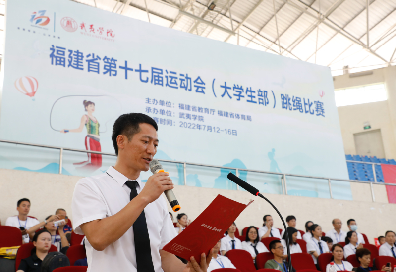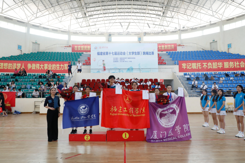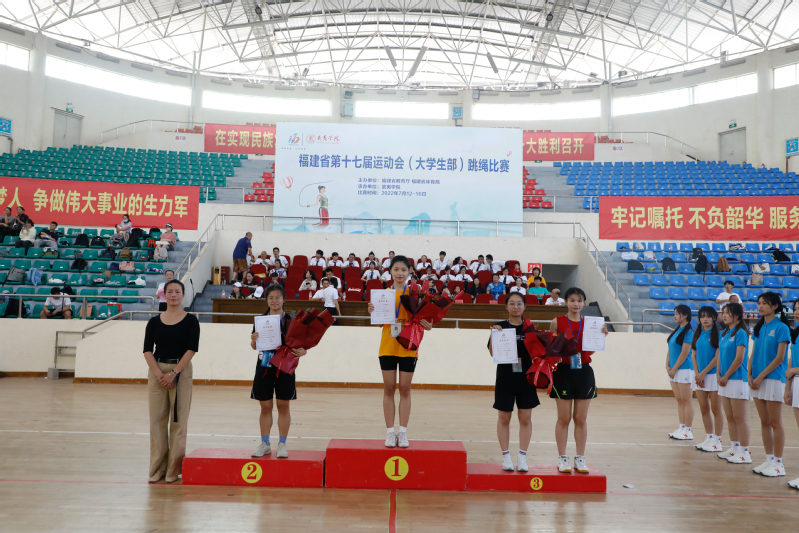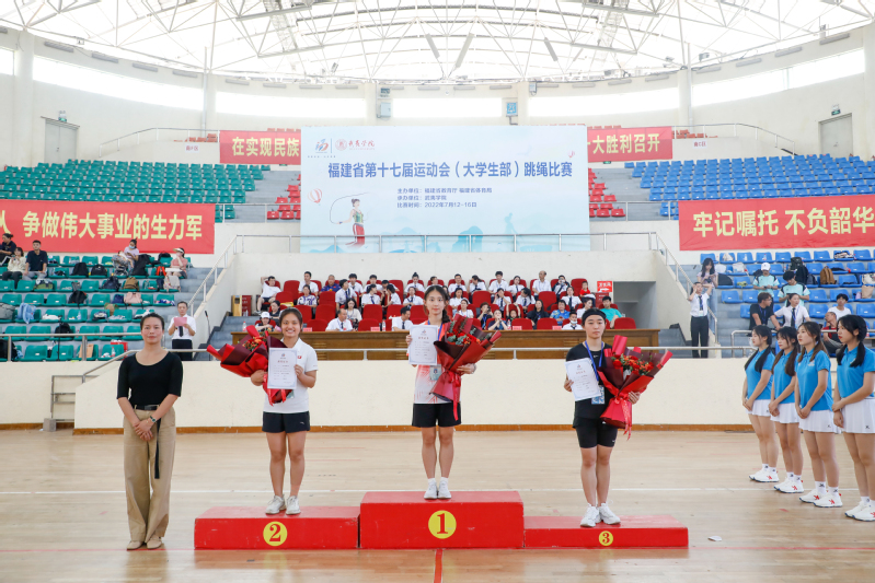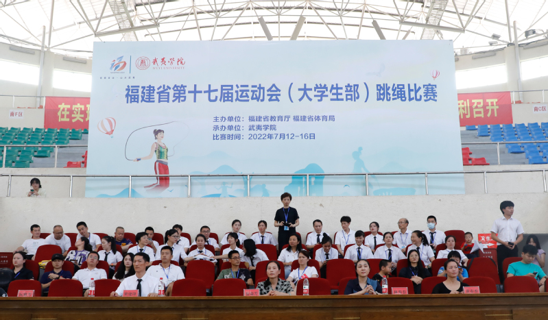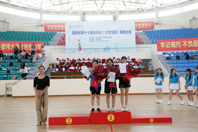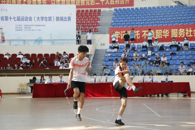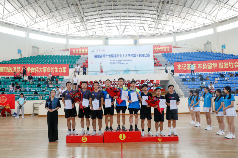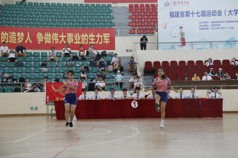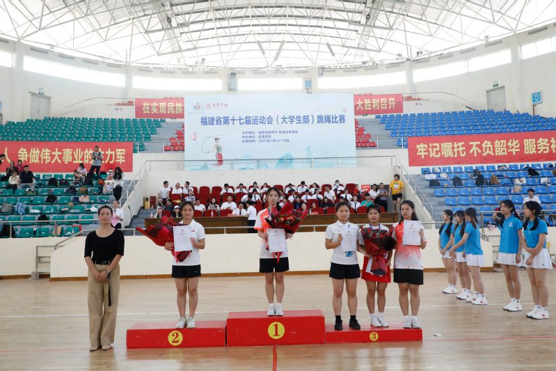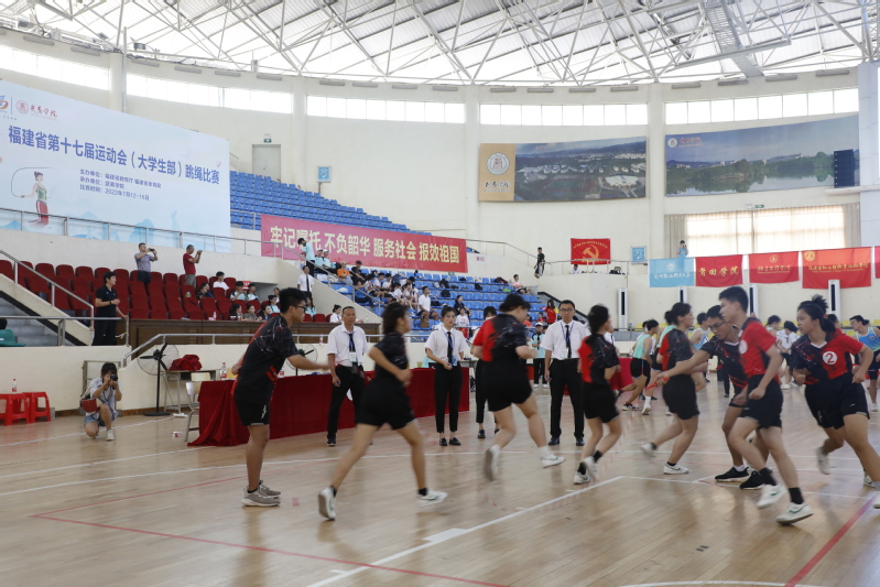 7月16日,福建省第十七届运动会(大学生部)跳绳比赛在我校圆满落幕。四天的时间里,全省各高校共28支代表队的300余名运动员以“绳”会友,在校体育馆掀起了跳绳运动的新高潮。福建省大学生体育协会跳绳分会顾问徐瑞芳、福建省大学生体育协会跳绳分会副会长林秀春出席活动,福建省大学生体育协会跳绳分会秘书长,跳绳国家级裁判梁建锋、武夷学院竞赛部部长黄春香以及裁判员、教练员、运动员参加闭幕式。
