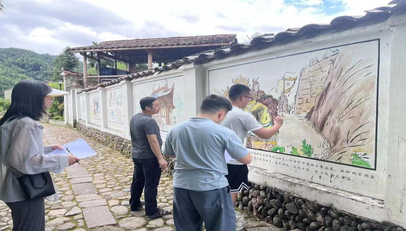 随后,社会实践队队员利用自己所学的专业优势,对金坑乡下坊老街里红色文化墙上脱落的地方进行修复和补色,为传承红色文化和谱写乡村振兴新篇章贡献自己的力量。