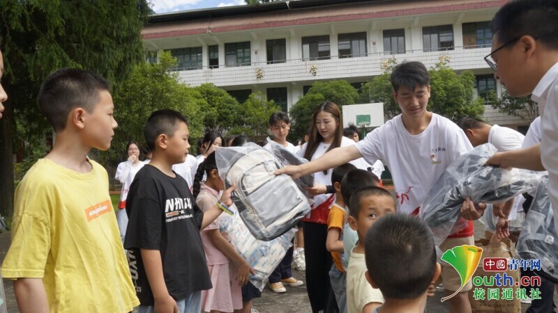 ▲图为实践队成员在金坑小学为学生捐赠文具用品。