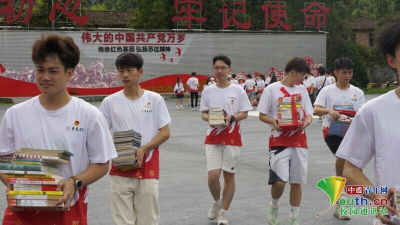 ▲图为实践队成员为留守儿童搬运爱心书籍。