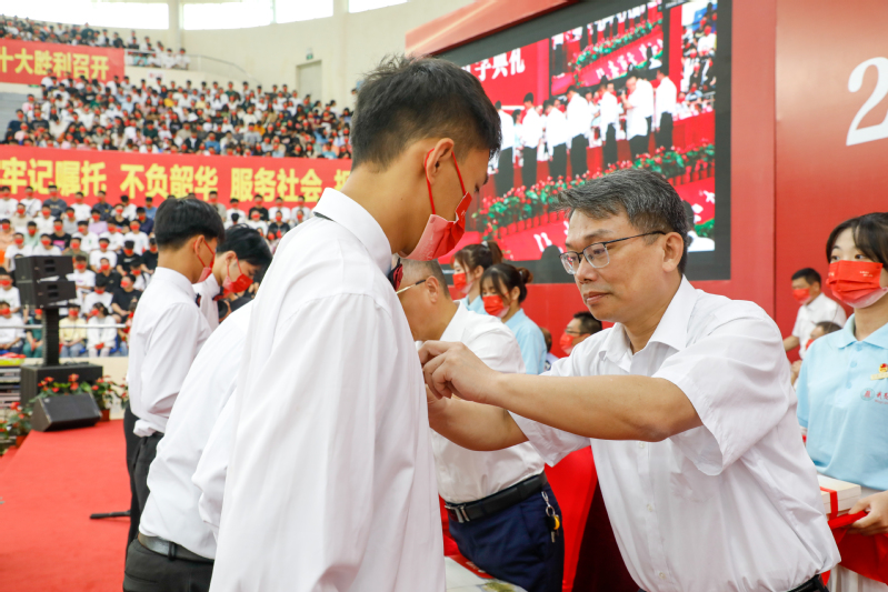 典礼上,校领导为新生代表佩戴校徽、赠送书籍。在现场师生们共同见证下,新生全体起立,集体佩戴校徽。
