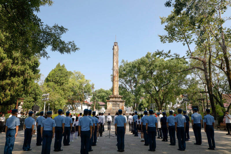 校党委书记庄祥生与武夷山市四套班子主要领导、人武部领导登上纪念碑基座,上前整理花篮缎带。随后,参加仪式的全体人员怀着崇敬的心情,共同瞻仰革命烈士纪念碑,向革命先烈致以最崇高的敬意。