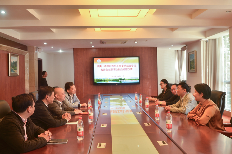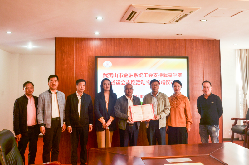 为助力省运会志愿活动开展,10月21日,武夷山市金融系统工会支持省运会志愿活动物品捐赠仪式在我校举行。校党委委员、副校长廖斌,中国人民银行武夷山支行行长周上青及武夷山金融系统单位领导,校学生工作部、团委等有关负责同志出席仪式。