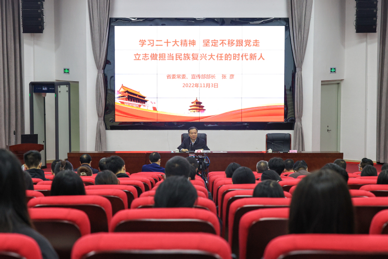 随后,张彦以《学习二十大精神 坚定不移跟党走 立志做担当民族复兴大任的时代新人》为题作宣讲报告。他指出,党的二十大是在全党全国各族人民迈上全面建设社会主义现代化国家新征程、向第二个百年奋斗目标进军的关键时刻召开的一次十分重要的大会。党的二十大报告回顾总结了过去五年的工作和新时代十年的伟大变革,阐述了开辟马克思主义中国化时代化新境界、中国式现代化的中国特色和本质要求等重大问题,擘画了全面建成社会主义现代化强国的宏伟蓝图和实践路径,就未来五年党和国家事业发展制定了大政方针、作出了全面部署,是中国共产党团结带领全国各族人民夺取新时代中国特色社会主义新胜利的政治宣言和行动纲领,是一篇马克思主义的纲领性文献。我们要认真贯彻落实党中央统一部署和省委工作要求,迅速兴起学习宣传贯彻党的二十大精神热潮,深刻领悟“两个确立”的决定性意义,不断增强“四个意识”、坚定“四个自信” 做到“两个维护”。