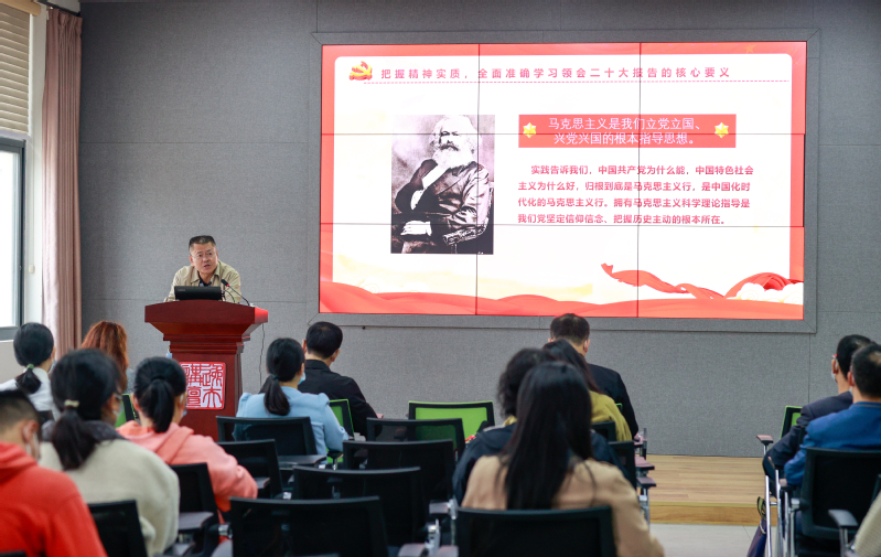 朱金生从“把握精神实质,全面准确学习领会二十大报告的核心要义”、“强化党章意识,忠诚捍卫‘两个确立’、坚决做到‘两个维护’”、“牢记使命担当,将党的二十大精神贯穿到工会工作各方面、全过程”三个方面,对党的二十大精神进行了详细解读,并分享自己的学习体会。