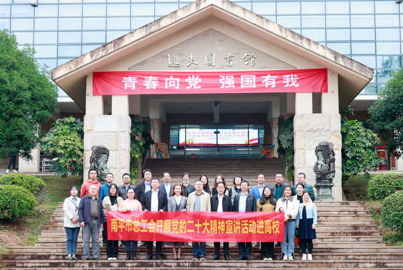 11月15日,南平市总工会开展学习宣传贯彻党的二十大精神宣讲进高校活动,市总工会党组书记、常务副主席、一级调研员朱金生到我校宣讲党的二十大精神。校党委副书记、校工会主席陈金瑞出席宣讲活动。市总工会和校工会领导以及校工会基层干部、各级劳模代表、教职工代表到会听讲。