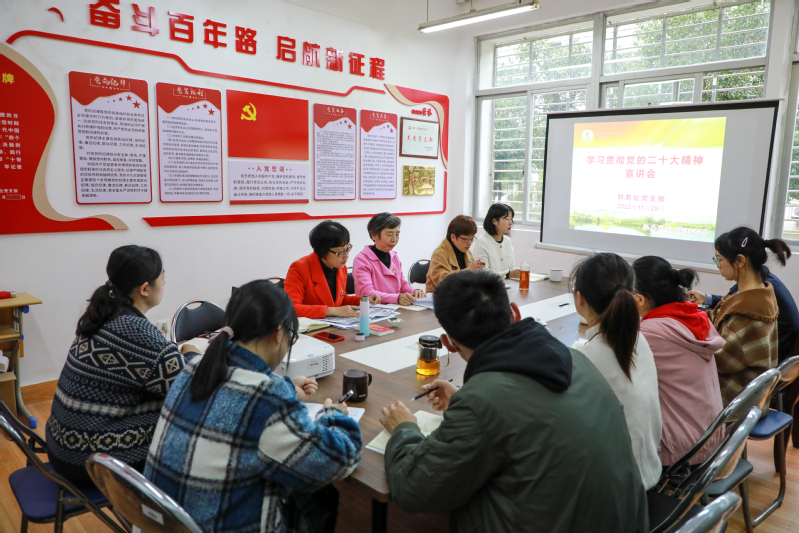 11月28日,财务处党支部书记龚文华主持召开党的二十大精神宣讲会,校党委学习贯彻党的二十大精神宣讲团成员、机关党委副书记、党委统战部部长庄敏到会宣讲。