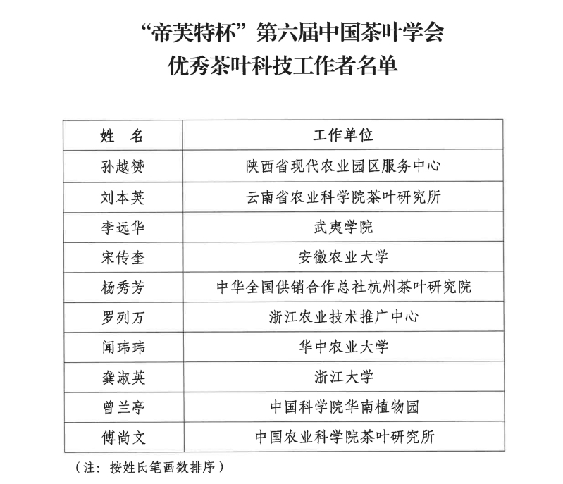 中国茶叶学会优秀茶叶科技工作者是经科技部批准设立的中国茶叶学会科学技术奖子奖项,主要奖励在茶叶科学研究、生产实践、科普工作中做出显著成绩和突出贡献的在职科技工作者。