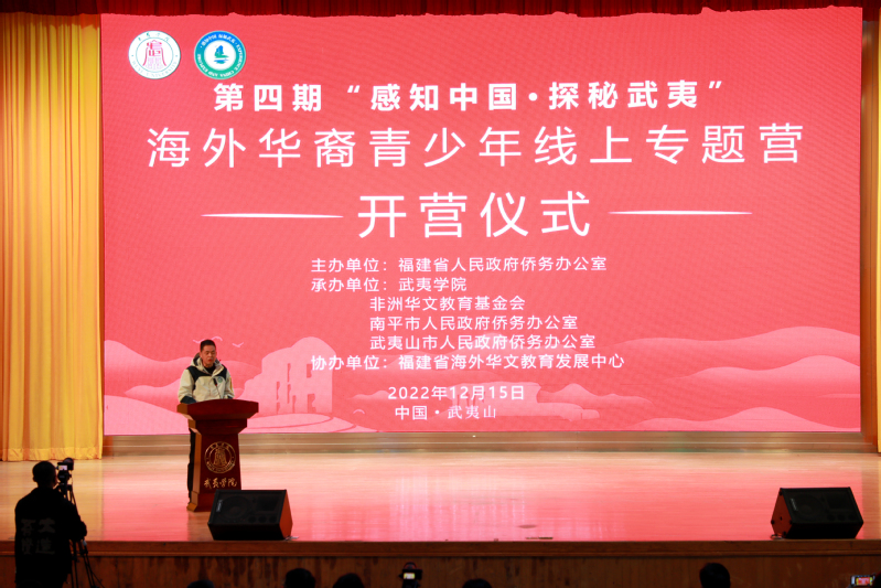 12月15日,由福建省人民政府侨务办公室主办,武夷学院、非洲华文教育基金会、南平市人民政府侨务办公室及武夷山市人民政府侨务办公室承办,福建省海外华文教育发展中心协办的第四期“感知中国·探秘武夷”海外华裔青少年线上专题营在我校正式开营。福建省委统战部二级巡视员张志英,校党委副书记、校长吴承祯出席开营式,南平市人民政府侨务办公室、武夷山市委、武夷山市文旅局、武夷山市五夫朱子学校及我校相关职能部门负责人、师生代表在主会场参加活动。中国驻约堡总领馆主任李敬军,非洲华文教育基金会主席韩芳,博茨瓦纳华文教育辅导中心、毛里求斯中文教师联合会、尼日利亚龙之梦中文学校及236名来自17个国家的海外华裔青少年在线上分会场参加活动。开营仪式由武夷学院党委委员、副校长郑细鸣主持。