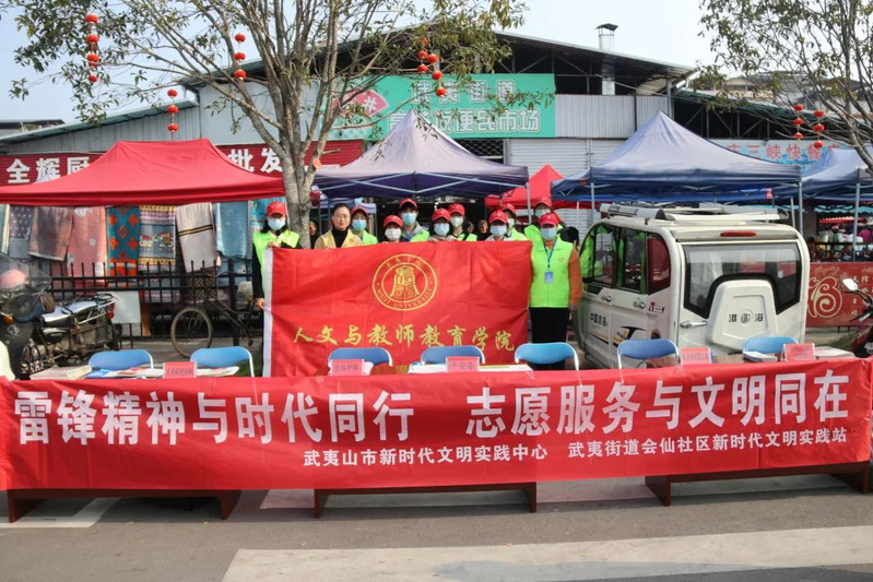 人文与教师教育学院志愿服务队前往武夷山会仙社区,配合会仙社区负责人在市集发放传单,向群众普及用火、防诈骗等知识。