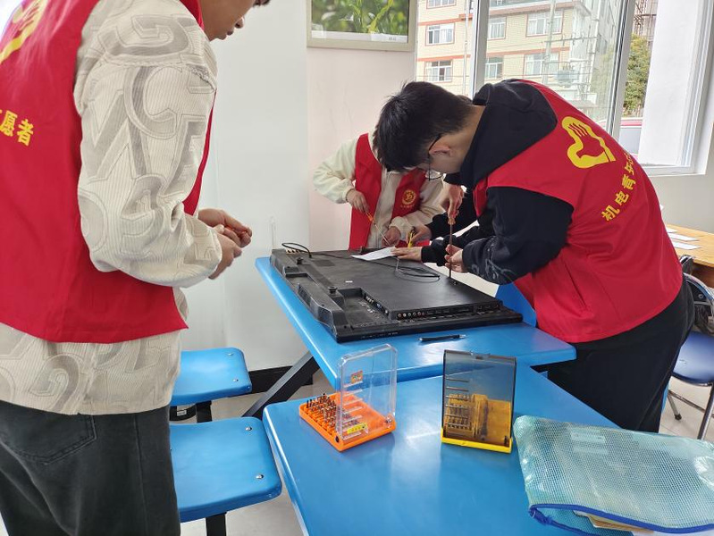 图为义务维修小队在前兰村村民活动中心维修液晶电视
