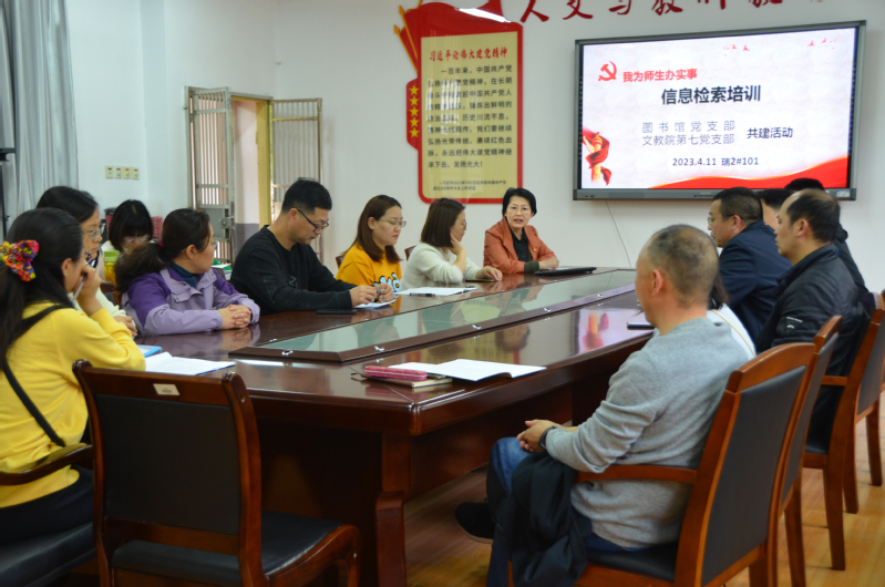 为深入贯彻落实党的二十大精神,贯彻落实“深学争优、敢为争先、实干争效”行动部署,推进“我为师生办实事”实践活动取得实效。4月11日,图书馆与人文与教师教育学院开展党支部共建活动,图书馆党支部为人文与教师教育学院教工第七党支部举办“我为师生办实事”——信息检索培训会,帮助教师解决文献检索中遇到的问题。图书馆馆长陈志宏,人文与教师教育学院党委书记王晓新、院长李文斌出席活动,近30名党员教师参加培训会。