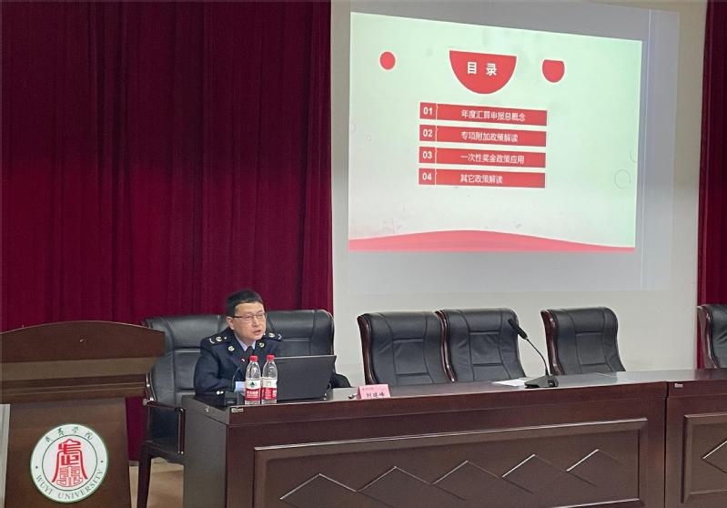 为帮助我校师生顺利完成2023年度个税申报事项并深入解读个税政策,4月9日,财务处举办“个人所得税汇算操作与政策解读”专题讲座,南平市第一税务局副局长刘建峰详细解读了年度汇算申报、专项附加扣除政策、一次性奖金政策应用以及劳务报酬的税务处理。