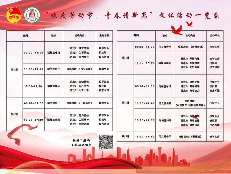 | 1 | “欢度劳动节,青春谱新篇”文体活动 | 5月1日-5月5日 | 瑞樟篮球场、同文报告厅 | 校团委 | 校学生会、校社联、校大学生艺术团 |
