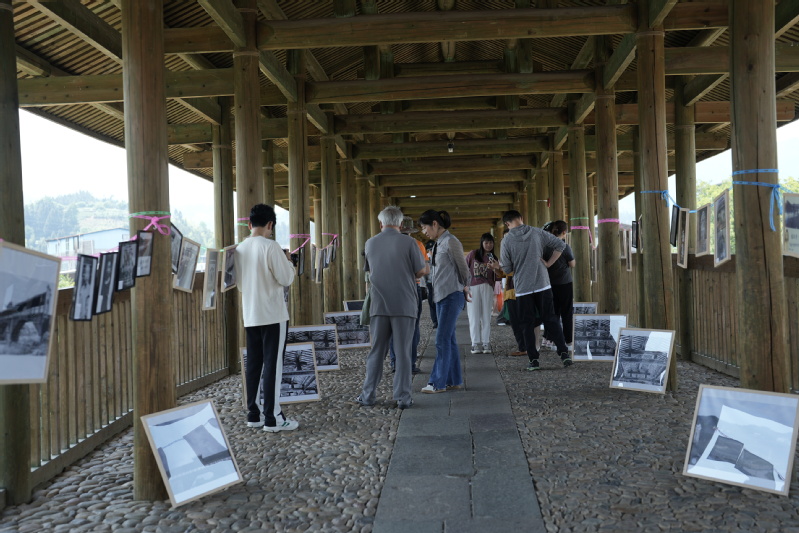 本次摄影展的亮点是余庆桥的历史影像文献纪实展。国家文物保护单位——余庆桥是南门街的地标性景观,是闽东北廊桥的代表性建筑,它优美的身姿曾在《清明上河图》中出现。在武夷山文保中心和地方文化研究者的支持和帮助下,策展老师和同学们搜集了30余张、从清朝到民国的珍贵历史老照片,并利用AI软件进行高清修复。展览在余庆桥上进行,吸引了众多社区居民驻足欣赏。一位大姐在一张翻拍的1984年以余庆桥为背景的南门小学教师合影前久久驻足,她指着画面中的一位女性激动的告诉记者:“这是我妈妈,她现在已经快90岁了,我家里都没有这张照片,太珍贵了!”策展教师表示将把这张照片的电子版送给她,她非常高兴。这是余庆桥的历史影像文献首次系统全面的展现在世人面前,许多参展者纷纷拍照留念并转发朋友圈。参展的同学们还在现场支起了小摊位,为居民免费拍摄打印照片。此次摄影展是对余庆桥历史文化的有效普及传播,也进一步提高了大家保护爱惜文物的意识。