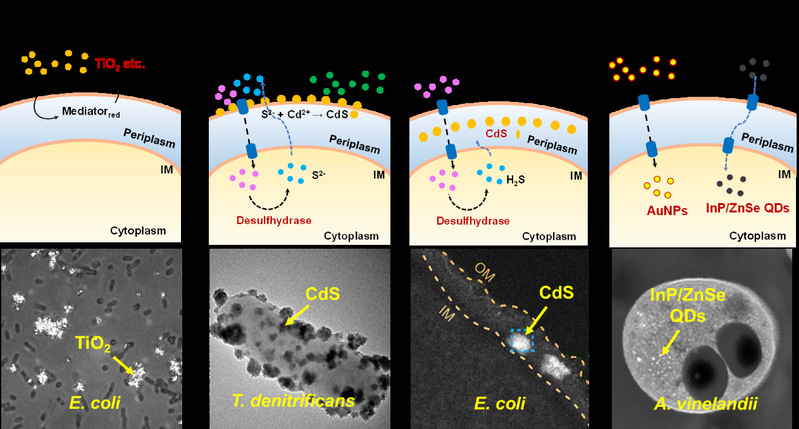 图4 光活性材料与微生物之间的空间关系。(A)分离型BPEC系统的示意图,通过电子穿梭体来介导光电子转移,如E. coil-TiO2;(B)表面敏化BPEC系统的示意图,通过微生物诱导的CdS在细胞膜表面合成,如T. denitrificans-CdS;(C)周质空间敏化BPEC系统的示意图,通过在周质空间内H2S与Cd2+的反应,如E. coil-CdS;(D)细胞内敏化BPEC系统的示意图,通过微生物的摄取过程,如A. vinelandii-InP/ZnSe量子点。