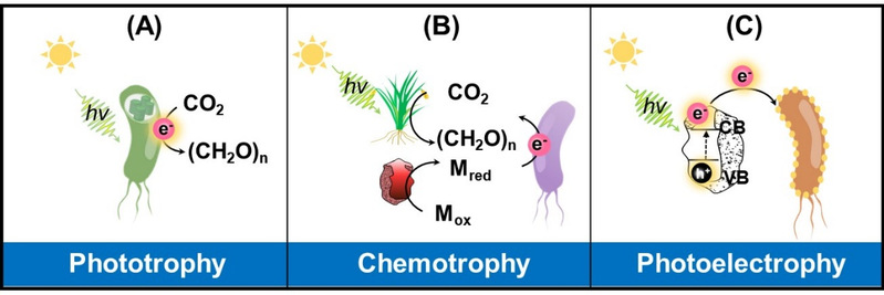图1 微生物能量转换系统的类型。(A)利用太阳能作为直接能量来源的光能营养型。光合微生物光合作用合成生物质((CH2O)n);(B)以光合产物为能量来源的化能营养型。非光养生微生物利用光合产物((CH2O)n)或光诱导还原无机化合物(如Fe2+)作为能量来源来驱动其代谢;(C)以光电子为能量来源的光电能营养型。非光养生微生物通过与光活性材料耦合,利用光电子来驱动其代谢。