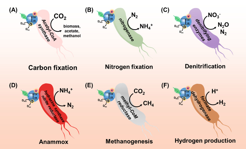 图3 BPEC系统中的微生物类型。(A)固碳微生物。微生物通过Wood-Ljungdahl途径将光电子用于驱动CO2还原为有机底物;(B)固氮微生物。携带固氮酶的微生物利用光电子将N2还原为NH4+;(C)反硝化微生物。携带反硝化酶的微生物利用光电子将NO3-还原为N2O/N2;(D)厌氧氨氧化微生物。具有联氨合成酶和亚硝酸还原酶的厌氧氨氧化细菌利用光电子加速将NH4+转化为N2;(E)产甲烷微生物。具有甲基-辅酶M还原酶的产甲烷菌利用光电子将CO2还原为CH4;(F)产氢微生物。具有甲酸脱氢酶的微生物利用光电子促进产氢。
