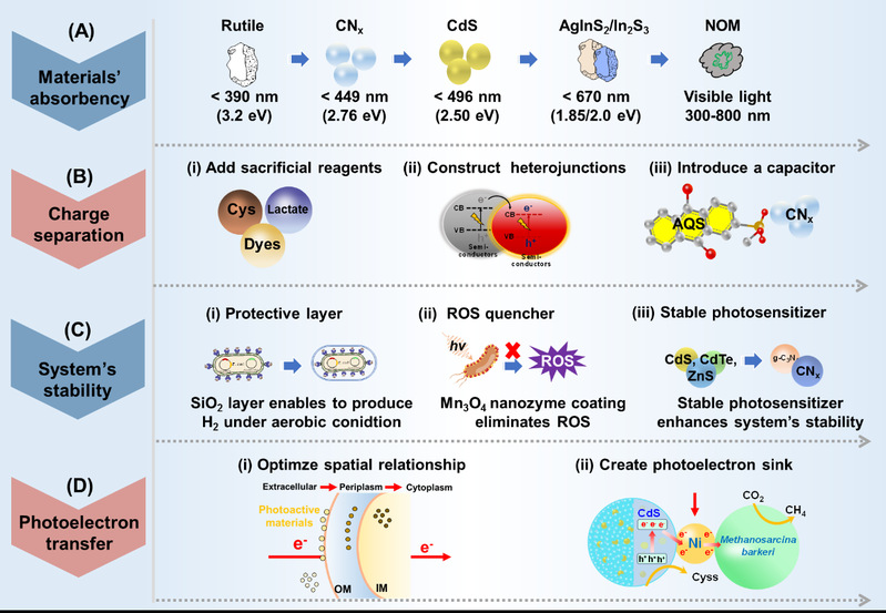 图5 BPEC系统在材料光吸收性、载流子分离、系统的稳定性和光电子传输方面的调控。(A)当前BPEC系统中使用的光活性材料的吸收范围,从紫外光到可见光;(B)通过添加牺牲试剂、构建异质结或引入具有电容功能的光敏材料来提高载流子分离能力;(C)通过加入保护层、活性氧(ROS)淬灭剂和稳定的光敏剂来增强系统稳定性;(D)通过优化光敏剂与微生物之间的空间关系,或创建光电子汇(如镍原子掺杂)来提高光电子传输效率。