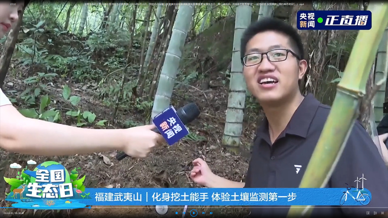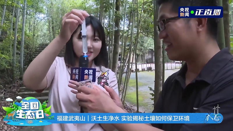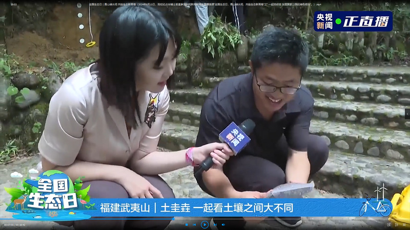 当天上午,节目组走进武夷山,我校生态环境监测与国家公园保护领域研究学者、生态与资源工程学院纪占华副教授受邀在“一起挖呀挖 发掘武夷山的绿色密码”专题向全国直播授课,现场讲授了森林样地选取、土壤剖面挖掘、表层土采样、样地地理信息标记、环境要素监测、地表植被生长指标测定等土壤采样基本知识点,详细介绍了武夷山国家公园土壤性质垂直分布特征、植被生长指标与土壤等环境因子指标之间相关性等理论,并通过土壤过滤实验,形象描述了现场样地土壤抗蚀性和涵养水源的潜力。授课过程近20分钟,内容深入浅出、互动性强,充分展示了武夷山国家公园原真性以及生态保护的重要性。