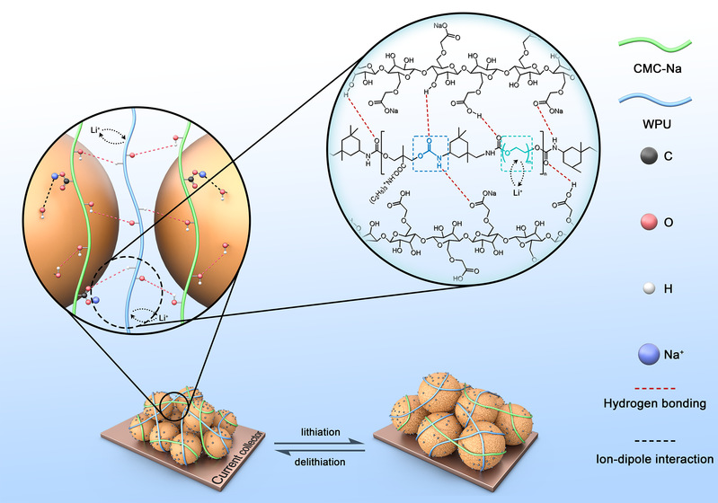 近日,我校生态与资源工程学院电化学储能与电池材料研究团队孙兴燊老师与南京林业大学徐徐教授、中国林业科学研究院林产化学工业研究所王宏晓副研究员合作,将羧甲基纤维素钠和水性聚氨酯物理共混,构建具有氢键作用的水溶性粘结剂,并基于VASP软件进行了分子动力学模拟。研究发现,在羧甲基纤维素钠中引入柔软的水性聚氨酯,可以提升粘结剂的断裂伸长率、锂离子扩散系数以及降低粘结剂的杨氏模量,足以承受硅颗粒的巨大体积变化,同时促进电极表面形成稳定的SEI层,从而大大提升电池的循环寿命。