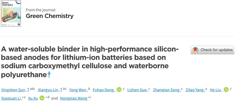 研究成果以“A water-soluble binder in high-performance silicon-based anode for lithium-ion batteries based on sodium carboxymethyl cellulose and waterborne polyurethane”为题,在线发表在国际权威期刊《Green Chemistry》(中科院一区TOP期刊,IF=9.3)。孙兴燊老师为第一作者,我校生态与资源工程学院李学全博士以及徐徐教授、王宏晓博士为共同通讯作者,武夷学院为论文第一完成单位。