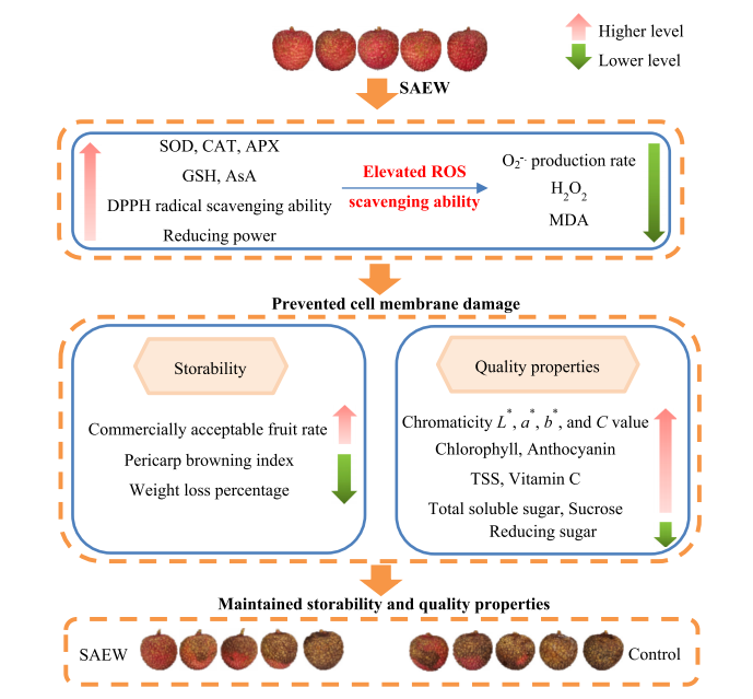 该研究发现,与对照组相比,SAEW处理不仅可以保持采后荔枝果实整个贮藏期较高的超氧化物歧化酶(SOD)、过氧化氢酶(CAT)和抗坏血酸过氧化物酶(APX)活性,还能保持较高的还原型抗坏血酸(AsA)和还原型谷胱甘肽(GSH)水平。此外,SAEW处理还可以增强1,1-二苯基-2-三硝基苯肼(DPPH)自由基的清除和还原能力,从而抑制超氧阴离子自由基(O2-.)产生速率增加,并防止过氧化氢(H2O2)和丙二醛(MDA)过度积累。因此,SAEW处理可以通过减少活性氧(ROS)积累来抑制果皮膜脂过氧化损伤,从而有效防止荔枝果皮氧化褐变。
