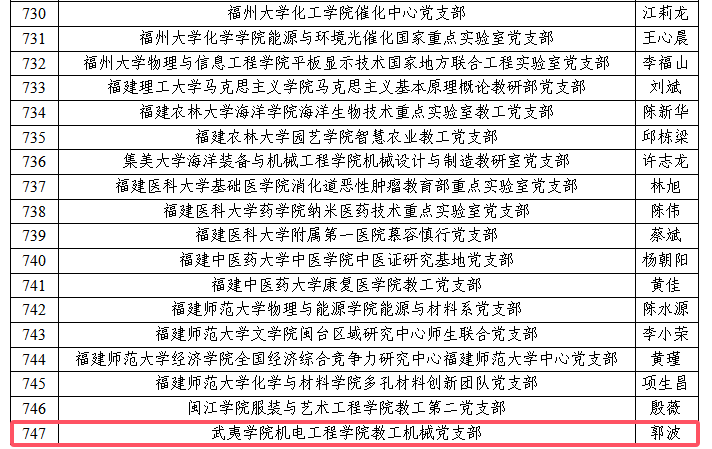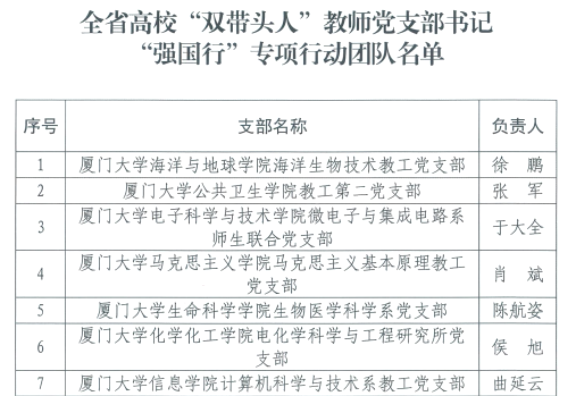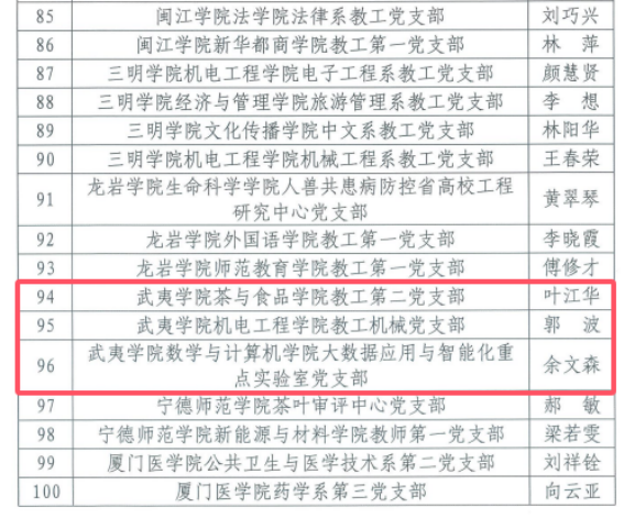 近日,教育部、福建省委教育工委公布了全国、全省高校“双带头人”教师党支部书记“强国行”专项行动团队公示名单,我校机电工程学院教工机械党支部(负责人:郭波)入选全国、全省高校“双带头人”教师党支部书记“强国行”专项行动团队,茶与食品学院教工第二党支部(负责人:叶江华)、数学与计算机学院大数据应用与智能化重点实验室党支部(负责人:余文森)入选全省高校“双带头人”教师党支部书记“强国行”专项行动团队。此项行动旨在以高质量党建引领高质量发展,充分发挥教师党支部战斗堡垒作用和党员先锋模范作用,不断强化“双带头人”队伍建设和作用发挥,引领广大师生在服务国家重大战略和地方经济社会高质量发展中作出更大贡献。