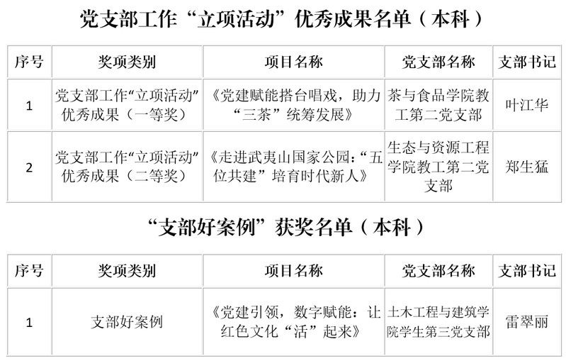 近日,中共福建省委教育工委公布了2022—2024学年全省高校党支部工作“立项活动”优秀成果和“党员好故事、书记好党课、支部好案例”获奖名单,我校3个项目荣获2022-2024学年全省高校党支部工作“立项活动”优秀成果和“党员好故事、书记好党课、支部好案例”,其中党支部工作“立项活动”优秀成果首次斩获一等奖。