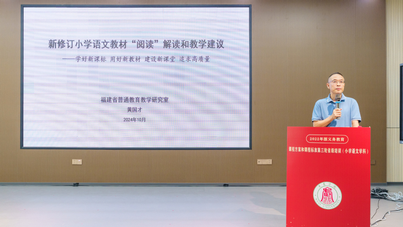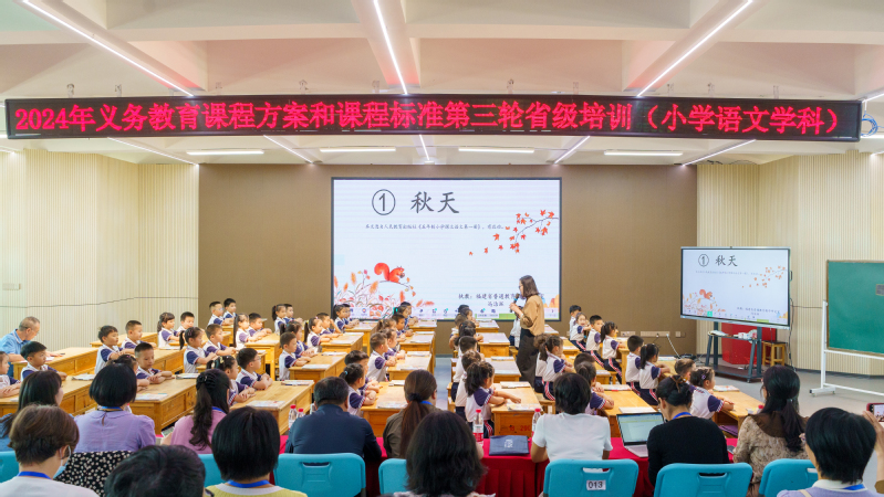 开班仪式后,一线优秀教师冯洁珏以“一年级《秋天》教学”的现场观摩课拉开了本次培训的序幕;黄国才为培训教师作《统编修订版教材“阅读”编排突出特点解读和教学建议》专题讲座。本次培训以线上线下相结合的方式,采用专家专题讲座、课堂教学观摩、评课议课等多种形式展开。同时,各地区组织教师观看线上直播。