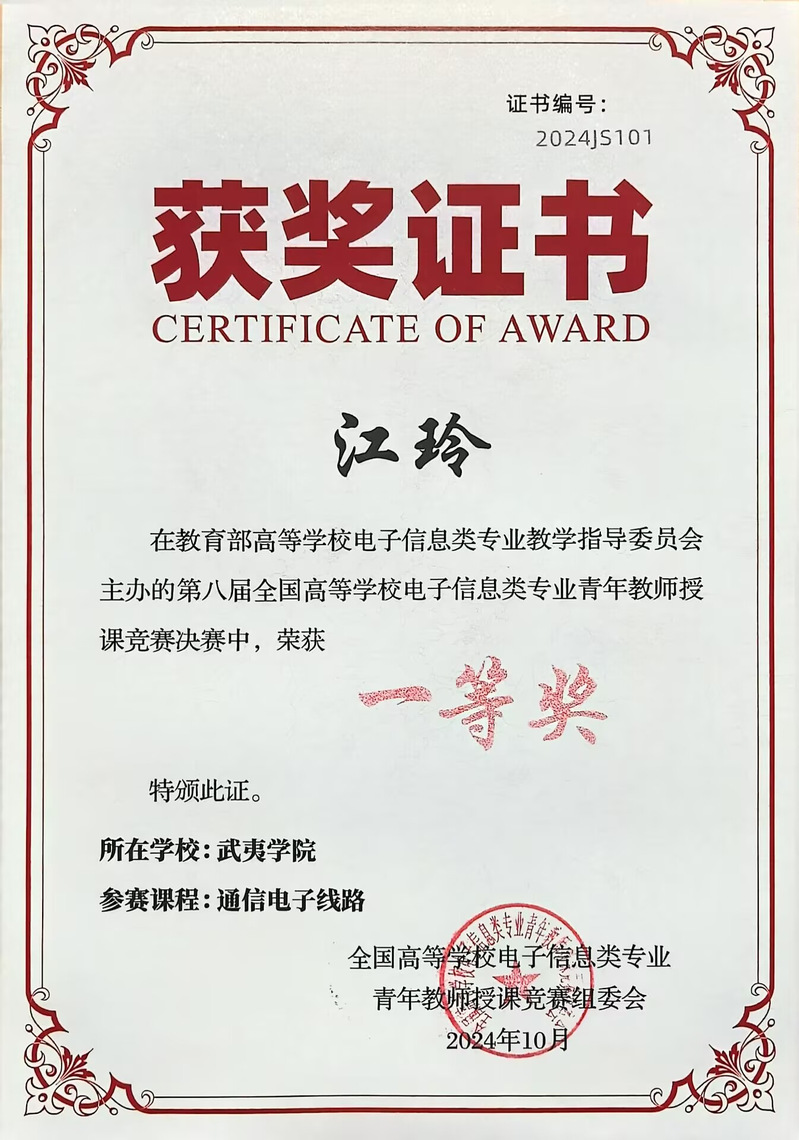 10月18日-20日,第八届全国高等学校电子信息类专业青年教师授课竞赛决赛暨专业建设研讨会在中国计量大学举办,经过激烈角逐,我校数学与计算机学院江玲老师荣获一等奖。