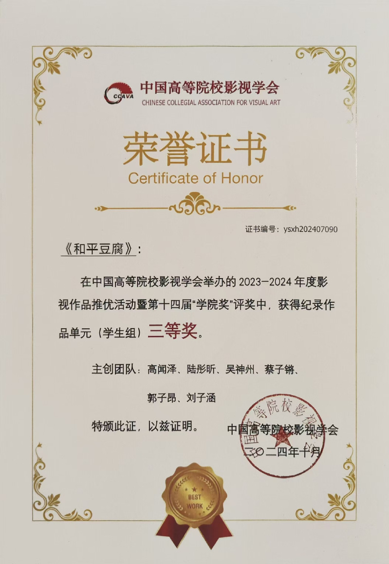 10月26日,中国高等院校影视学会“2023-2024年度影视作品推优活动”获奖结果揭晓。我校海峡成功学院2022级广播电视编导专业学生高闻泽、陆彤昕、吴神州、蔡子锵、郭子昂等创作的作品《和平豆腐》,获得三等奖,这是我校广编学子首次在该学会推优活动中获奖。