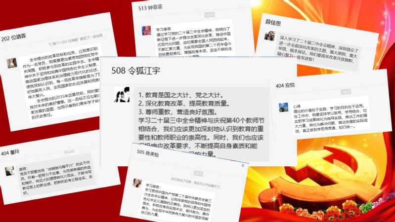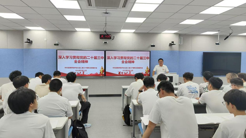 为深入学习贯彻党的二十届三中全会精神,进一步统一思想、凝聚共识,推动学习成果转化为推动发展的强大动力和实际成效,全体学生社区楼栋党支部积极响应号召,在社区、在教室组织开展党的二十届三中全会精神专题学习会。各社区党支部采取多种形式开展,如专题研讨、学习分享会、读书社、参观红色教育基地等形式,注重集中学习与研讨交流相结合,组织党员集中学习全会公报及相关解读材料,将理论知识内化于心、外化于行,引导广大学生党员深入学习领会全会精神,确保学习全覆盖、无死角。